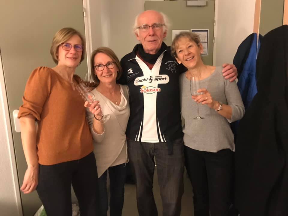 En équipe, c’est la Team Guidetti Horizon venue pour cela qui prend la première place suivie de l’AC Haute Vilaine et du Stade Rennais, S/T Tulle place 2 équipes au classement !!! Super. C’est donc encore un grand moment de marche nordique compétition avec de beaux podiums… Une manifestation réussie et un grand plaisir partagé, mais ce n’est pas fini. Bizarre, je me retrouve ainsi que Rodolphe avec le super maillot noir et blanc de l’AC Haute Vilaine, un bref moment de rêve…..pour la photo, une flûte de champagne à la main pour le traditionnel anniversaire de Céline Beucher et Stéphane Grégoire… une bonne habitude…..et cette année la course ayant lieu le samedi on en profite!!!Pour clôturer une belle et longue soirée ensemble et un retour sous la tempête Ciara expliquera le retard de ma chronique !!!