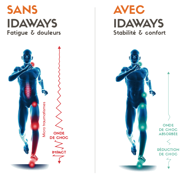 Les semelles Idaways réduisent considérablement les ondes de choc via leur technologie (non pas par ajout de matière molle telles que la mousse, gel etc), ce qui permet de conserver à la fois une stabilité idéale en course et au quotidien, un bon maintien de l’ensemble pied/cheville/genou et un amorti performant. En plus d’améliorer la performance et le bien être, les semelles réduisent considérablement la fatigue musculaire, les douleurs articulaires et viennent en prévention du mal de dos qui sont les principales conséquences des ondes de choc non contrôlées liées à la marche et la course.