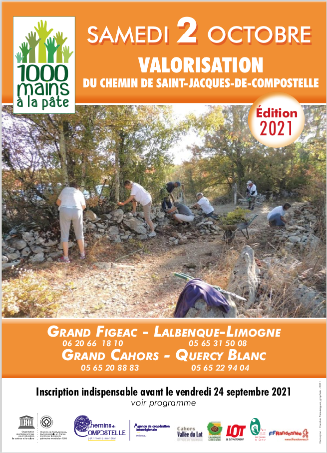 La 7ème opération de « 1000 mains à la pâte » aura lieu le samedi 2 octobre de 8h à 17h30, sur les 152 km de la traversée du département du Lot de Montredon, avant Figeac à Montlauzun, après Montcuq. Elle s’adresse aux habitants et bénévoles d’associations dans l’esprit de mettre en valeur et de tisser du lien humain autour du chemin.