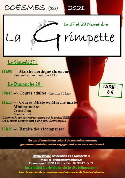 L’Association La Grimpette nous informe de son édition 2021. L’événement propose des courses, mais également une marche nordique chronométrée, qui se dérouleront à Coësmes (35134) le samedi 27 et le dimanche 28 novembre 2021.