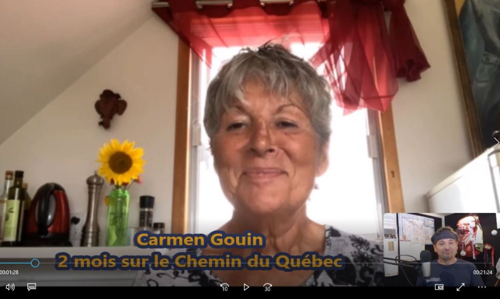 Carmen Gouin, âgée de 74 ans, est une vraie passionnée de la rando. Elle a pris 70 jours pour parcourir près de 1300 km sur les chemins de notre belle province. En bonne pèlerine, elle a mis la clé à la porte de chez elle et a débuté sa randonnée afin de rejoindre le Chemin du Québec pour y en marcher trois sections.