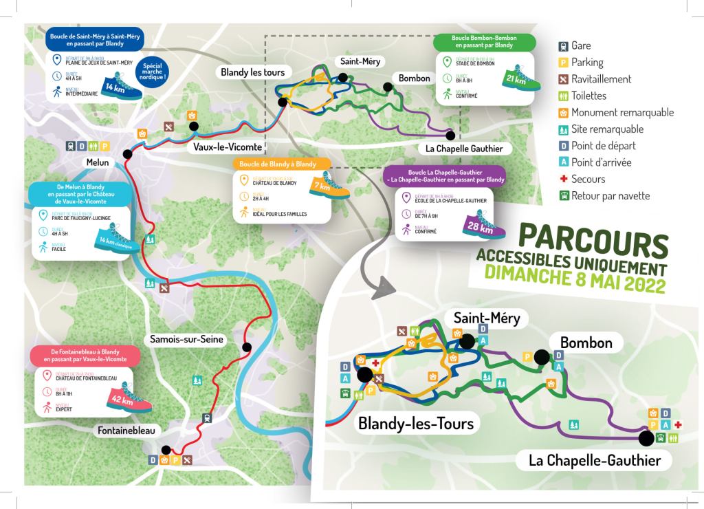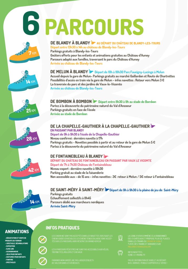 La Rando des 3 Châteaux prévue le dimanche 8 mai 2022 propose de nombreux parcours, dont le plus important, le 42 kilomètres. Ce dernier est une boucle de 42 km de Fontainebleau à Blandy Les Tours. Il relie les châteaux de Fontainebleau, Vaux-le-Vicomte et Blandy les Tours.