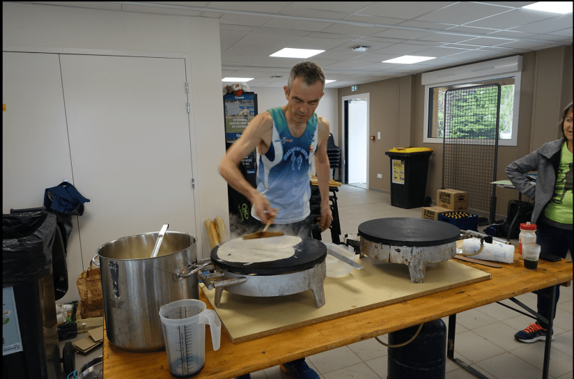 Ce samedi matin, beau soleil, on est en Bretagne, Olivier Guillemin, l’espoir du Club est sur le pont dès six heures, 4 kilos de pâte à crêpes, recette familiale, et on installe les crêpières…très convivial chez les Bretons ce sera avec la remise du Dossard 2 bières artisanales de la micro brasserie de St Nolff et pour les finisher donc une galette et un demi ! Olivier sera relayer par sa maman pour les 160 crêpes au programme…Pendant ce temps, Nathalie et Jean-Yves sont à fond sur l’organisation avec une belle équipe de bénévoles, rien n’est laissé au hasard.
