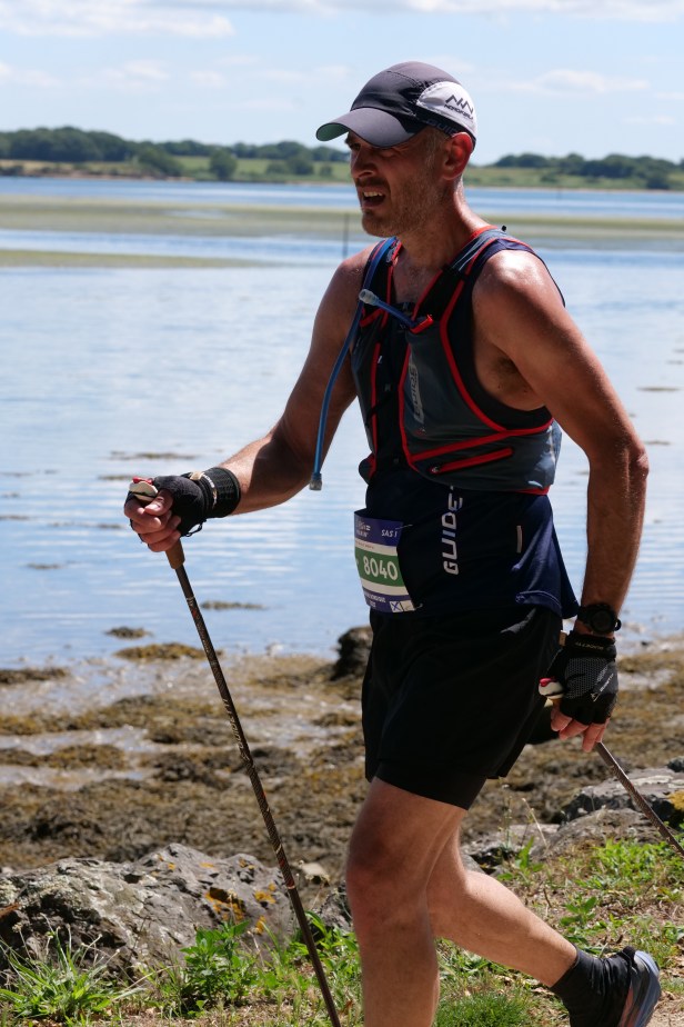 A la fois impressionnant et bon, enfant ce départ de quelques 1 224 Nordiques venus de tous les horizons, on commence par une petite visite d’Arradon, puis une boucle dans la campagne pour rejoindre le GR 34 vers le Moustoir, km 5.5, ce sera quelques 6 km avec Pads imposés mais sous la responsabilité de chacun. Le célèbre chemin des douaniers continue avec des paysages magnifiques, direction Penboc’h puis remontée de la rivière du Vincin pour changer de rive, direction l’Ile de Conleau, puis la pointe des émigrés et enfin la longue remontée vers le port de Vannes.