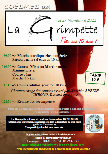 L’Association La Grimpette nous informe de son événement sportif. Au programme, des courses, mais également des marches qui se dérouleront à Coësmes (35134) le dimanche 27 novembre 2022.