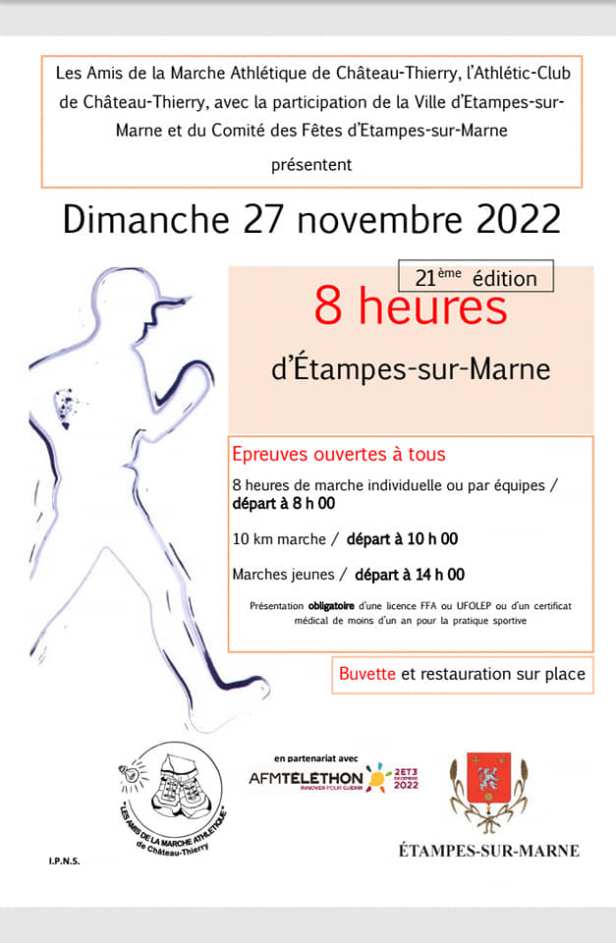 Les Amis de la Marche Athlétique de Château-Thierry, l‘Athlétic Club de Château-Thierry, avec la participation de la ville d’Etampes-Sur-Marne et du Comité d’Etampes-Sur-Marne organisent le dimanche 27 novembre 2022, les 8 Heures d’Etampes. L’épreuve avait été remportée en 2021, par Florian Letourneau, qui est annoncé au départ, de même que d’autres spécialistes de la marche de grand fond, comme Mathieu Olivares, Cédric Varain, ou encore Georges Ceccaldi.