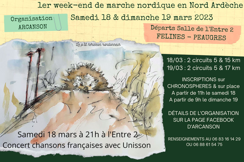 Les communes de Félines et Peaugres situées au nord de l’Ardèche, organisent les samedi 18 et dimanche 19 mars 2023 le 1er week-end de marche nordique et marche.
