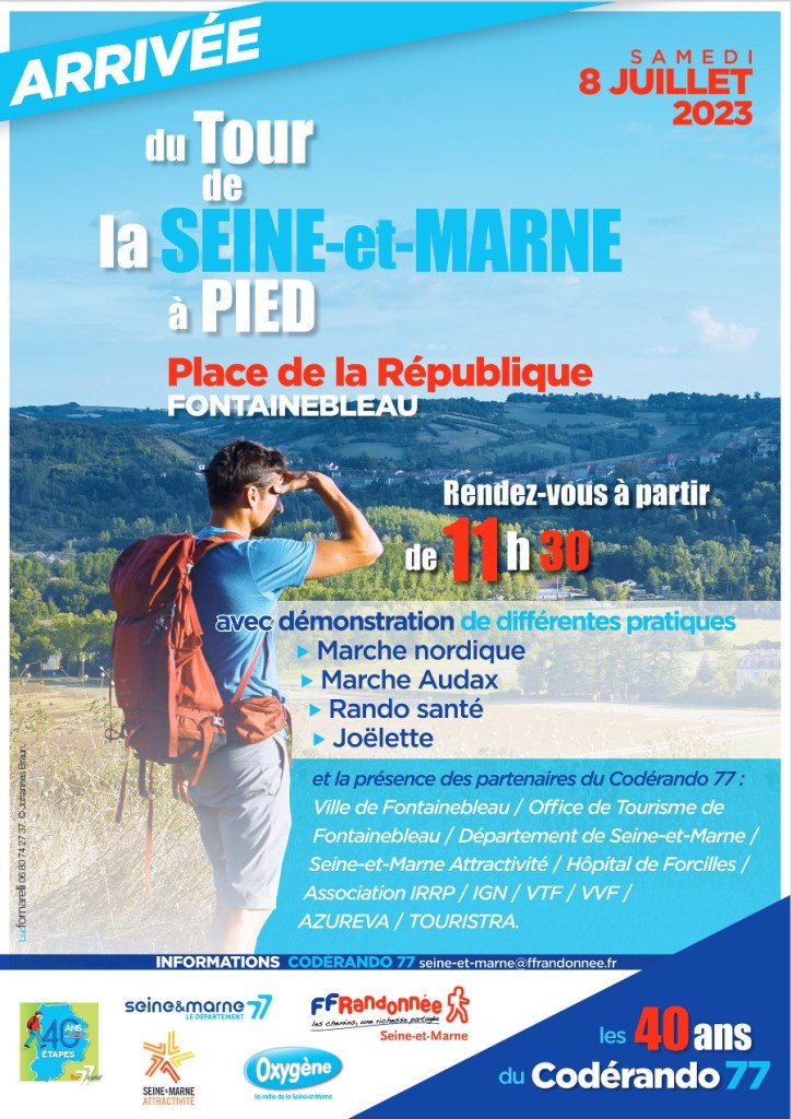 Le Tour de Seine et Marne à pied s’achève le samedi 8 juillet. Après 40 étapes (650 km) à travers le département, le Tour de Seine et Marne se cloturera à Fontainebleau, au terme d’une dernière étape de 16 kilomètres reliant Samois sur Seine à Fontainebleau.