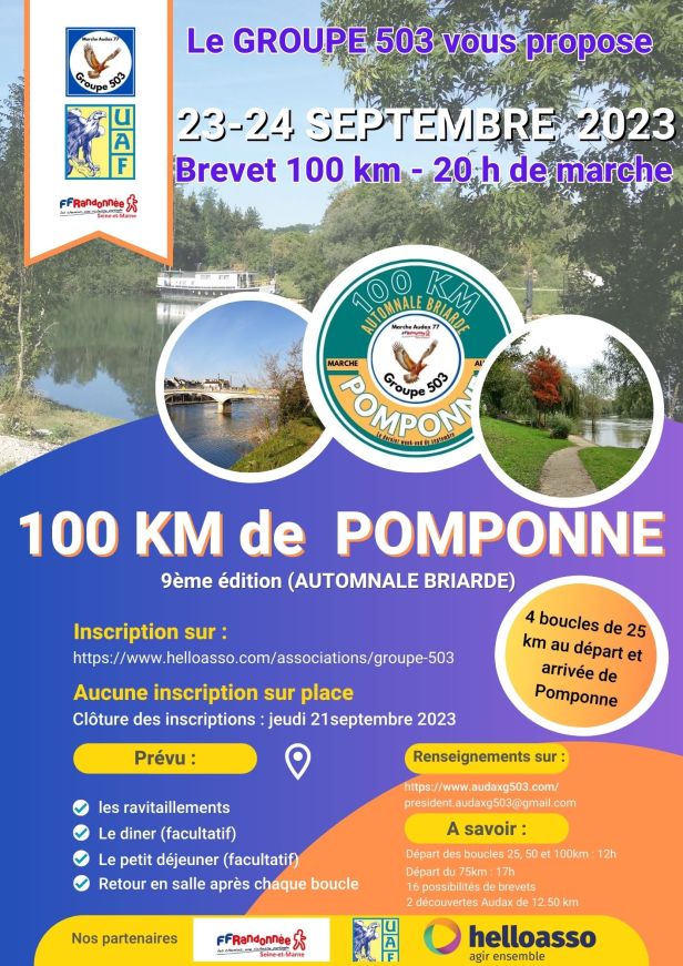 Pour toute inscription à cette 9ème édition de la manifestation sportive du Groupe 503, qui prend en cette année l’appellation : « 100 KM DE POMPONNE – AUTOMNALE BRIARDE », merci de cliquer ici.