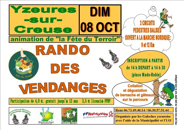 Organisée à l’occasion de la Fête du Terroir à Yzeures sur Creuse (37), la Rando des Vendanges propose 2 circuits pour les marcheurs : 8 et 12 km.
