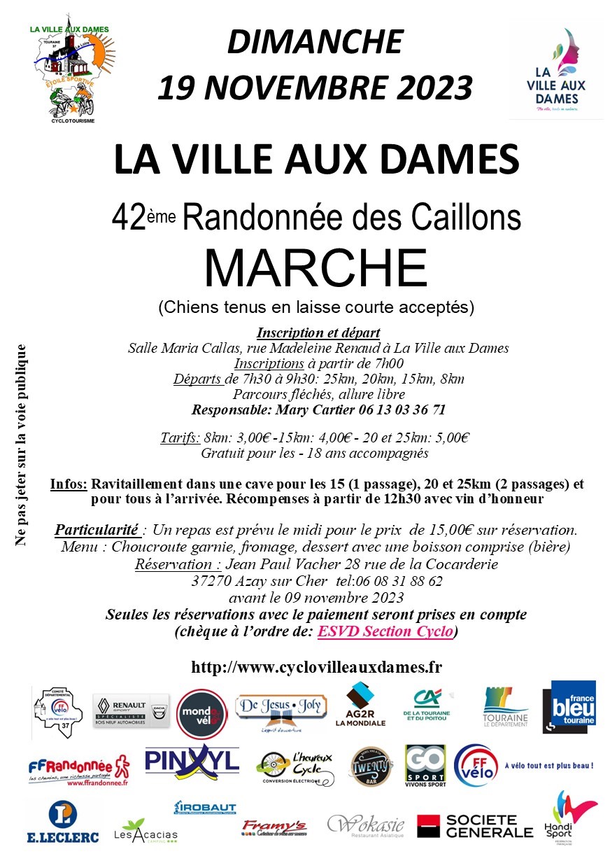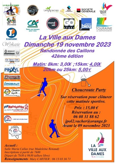 Une belle randonnée vous attend le dimanche 19 novembre 2023 avec la 42ème randonnée des Caillons. Plusieurs parcours au programme, 8km, 15 km, 20 km et 25 km. Parcours fléchés à allure libre avec pour particularités, un ravitaillement dans une cave et un repas prévu le midi pour le prix de 15 euros (choucroute garnie-fromage-dessert-boisson).