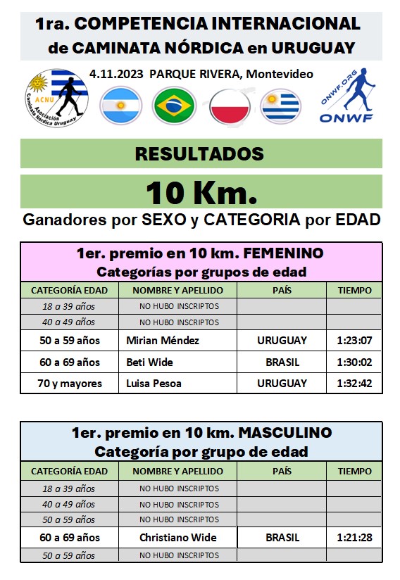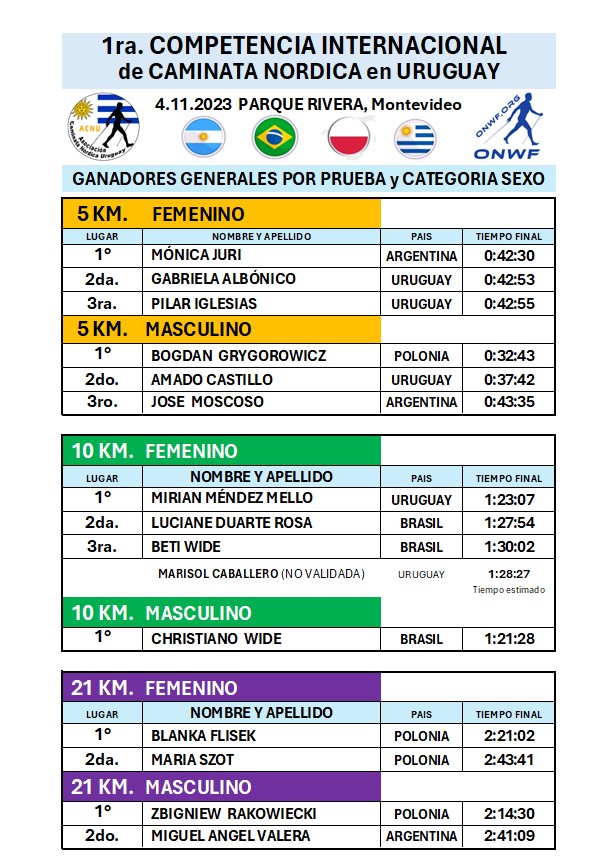 Organisée par l’Association uruguayenne de marche nordique (ACNU) et l’Original Nordic Walking Federation (ONWF), je vous propose un retour sur la compétition grâce à Carlos Ferreyra et Lilian Mazzella, respectivement Président et Secrétaire de l’ACNU. Un Grand Merci à eux !