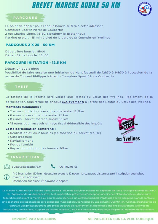 Une belle journée sport et solidaire est organisée le samedi 18 novembre 2023 à Montigny-le-Bretonneux avec des Brevets marche Audax au programme.