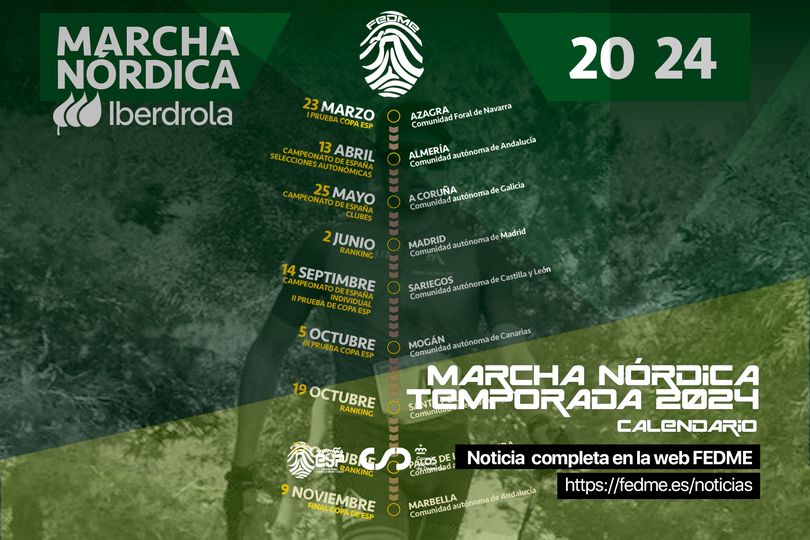 La FEDME a mis en ligne le nouveau calendrier des compétitions de marche nordique espagnoles pour la saison 2024. La saison débutera le 23 mars, avec la première épreuve de la Coupe d’Espagne à Azagra (Navarre), qui comporte 4 épreuves qui de disputeront entre les mois de mars et novembre (Lieux : Navarre, León, les îles Canaries et Andalousie. La dernière à Marbella le 9 novembre, clôturera la Coupe d’Espagne 2024.