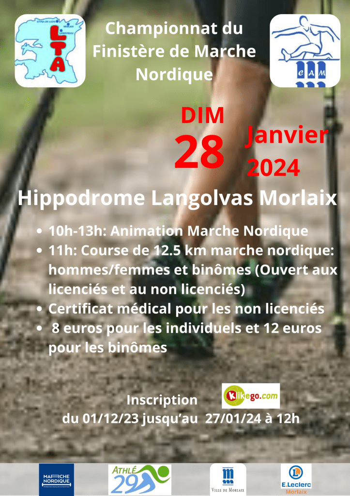L’hippodrome de Morlaix accueillera le dimanche 28 janvier 2024, le Championnat du Finistère de Marche Nordique. Compétition ouverte à tous (licenciés et non licenciés).