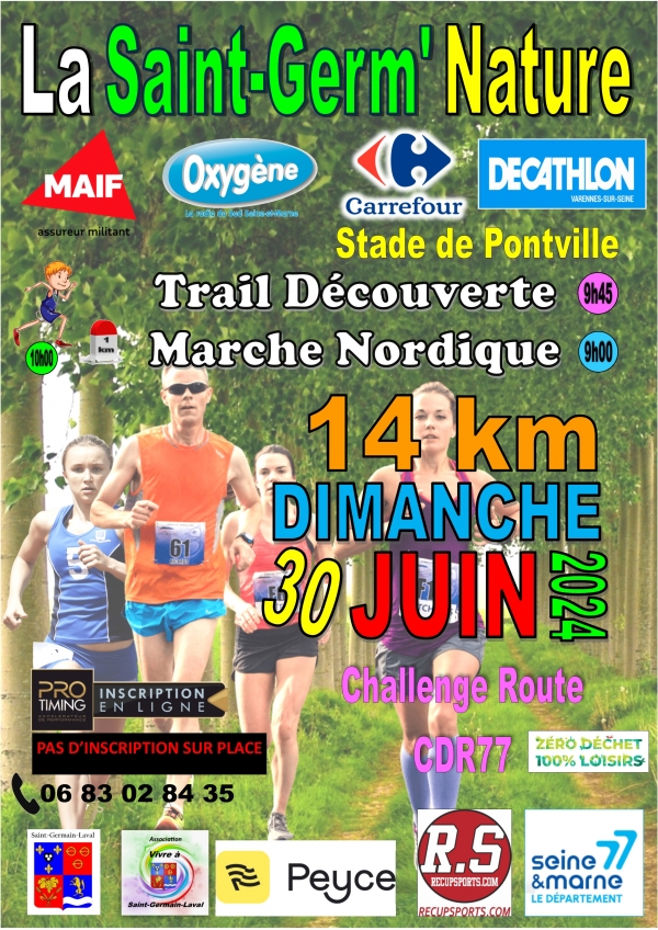 La Saint-Germ’Nature est une course Trail Découverte et Marche Nordique de 14 km qui se déroulera le dimanche 30 juin 2024 à Saint-Germain-Laval (77).