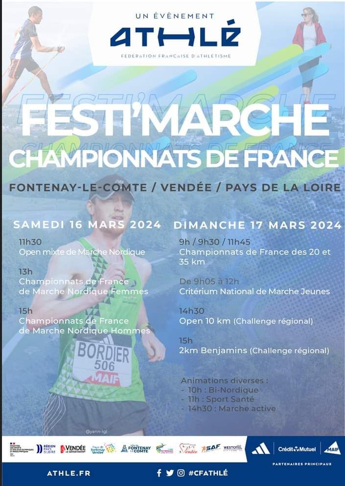 Comme annoncé précédemment, le Festi’Marche est l’occasion de retrouver les Championnats de France de marche nordique et les Championnats de France de marche athlétique sur un même week-end et au même endroit. A Fontenay Le Comte (85) pour cette édition 2024.