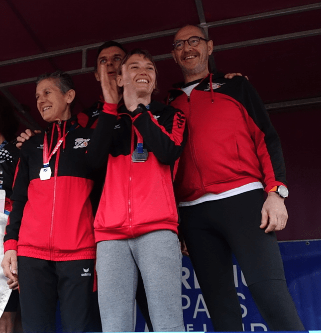 Championne de France Féminine 2024, Leslie Lejeune en 01 h 20 min 10 s, à huit secondes, que huit petites secondes, Élodie Besnier-Kerven tout en sourire, et enfin une battante qui a tout donné, Christiane Salvi avec un temps de 01 h 21 min 00s…un podium à plus de 9 km/h sur un terrain certes plat mais avec des appuis difficiles sur un sol herbeux et gorgé d’humidité !