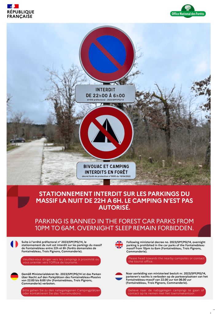 Face à leur encombrement puis à ce phénomène qui s’amplifie ces dernières années, le Préfet de Seine-et-Marne a pris un arrêté (n° 2023/SPF/PG/14), interdisant le stationnement (hors zones de bivouacs aménagées), entre 22 heures et 6 heures du matin sur tous les parkings des forêts de : Fontainebleau, Trois-Pignons et Commanderie.