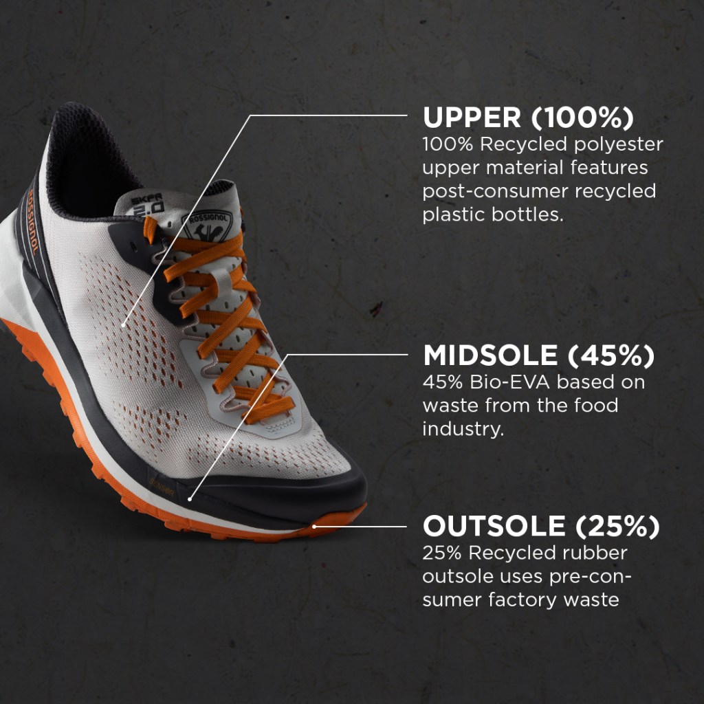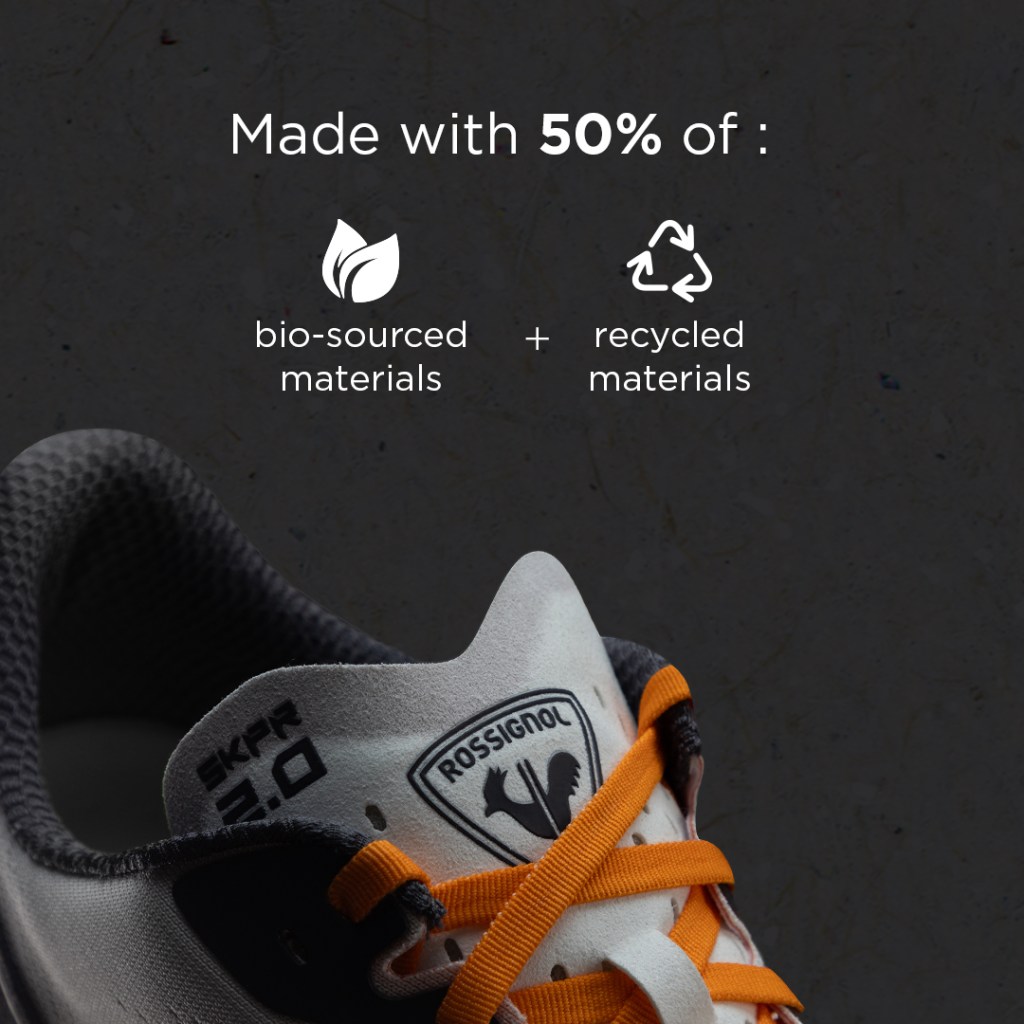 La SKPR 2.0 a atteint 50 % d’intrants responsables grâce à l’utilisation de matériaux biosourcés et/ou recyclés dans les accessoires (lacets, gousset, fils de couture), dans la doublure, dans les renforts, dans les structures (semelle intérieure, semelle intermédiaire, semelle extérieure) ainsi que dans la tige.