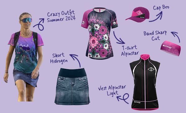 Pour les amateurs demontagne à la recherche d’un vêtement à la mode mais en même temps conçu pour la randonnée, Crazy propose la Skort Hidrogen, une jupe avec un short intégré conçu spécialement pour la randonnée. Le bib interne est réalisé avec un tissu Revolutional Slim, souple et élastique, tandis que la jupe est en Endurance Light, fraîche et technique. Le short Hidrogen s’associe au T-shirt Alpinstar, une proposition légère et respirante avec une forme asymétrique et des manches de couleur contrastante. Pour les jours où il fait plus froid, Crazy propose le Vest Alpinstar Light, un gilet hybride conçu pour la randonnée à utiliser comme couche supplémentaire : il est fabriqué en tissu soft shell Endurance, léger et compressible.