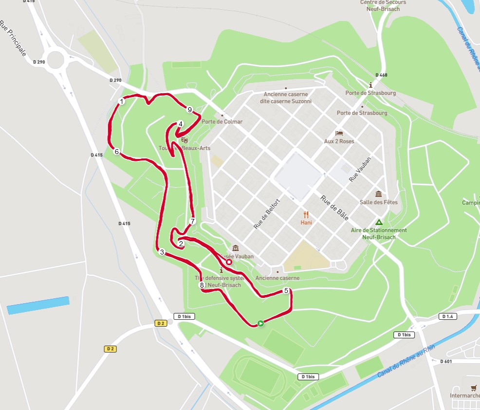Un parcours de 11,2 km un peu modifié cette année, juste un raidillon en plus à monter quatre fois, D+ 120 m environ, dans ce lieu chargé d’histoire, départ dans les douves et circuit alternant petits raidillons et descentes rapides sous les constructions de grès rose de la porte de Belfort.