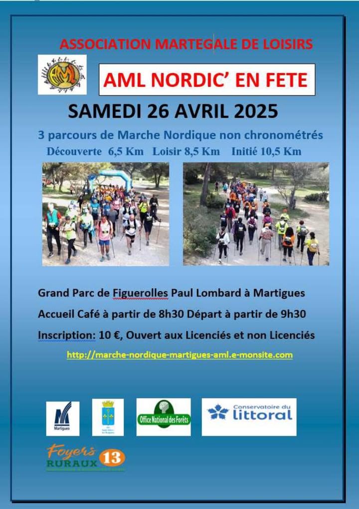 L’Association Martégale de Loisirs (AML) organise le samedi 26 avril 2025 un événement de marche nordique avec 3 parcours proposés : 6.5 km, 8.5 km et 10.5 km.