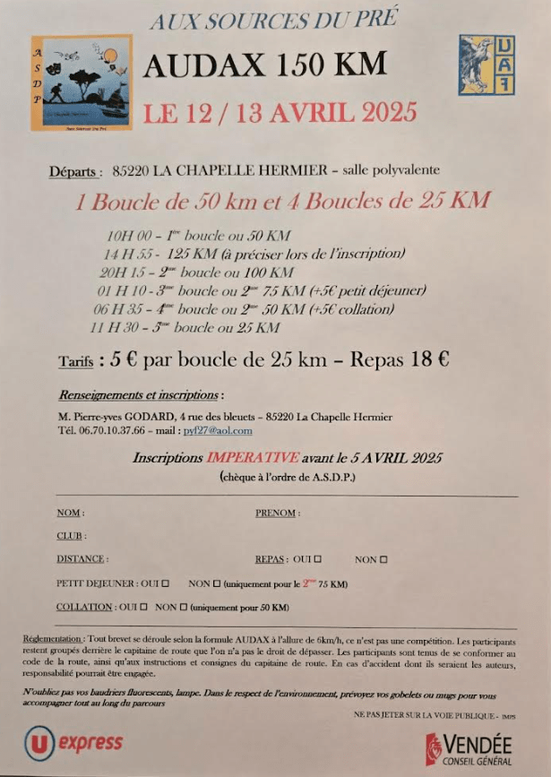 L’Association Aux Sources du Pré, association culturelle participant à la valorisation du site du Pré, autour du lac et de la vallée du Jaunay, organise à la Chapelle Hermier (85), une marche audax 150 km les 12 et 13 avril 2025.