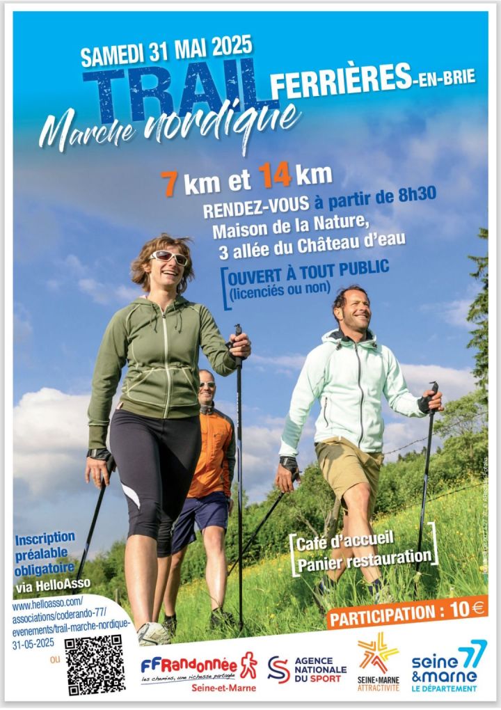 Le Coderando77 organise un Trail Marche Nordique le samedi 31 mai 2025, au départ de la Maison de la Nature de Ferrières-en-Brie (77). 2 distances sont proposés : 7 km et 14 km.