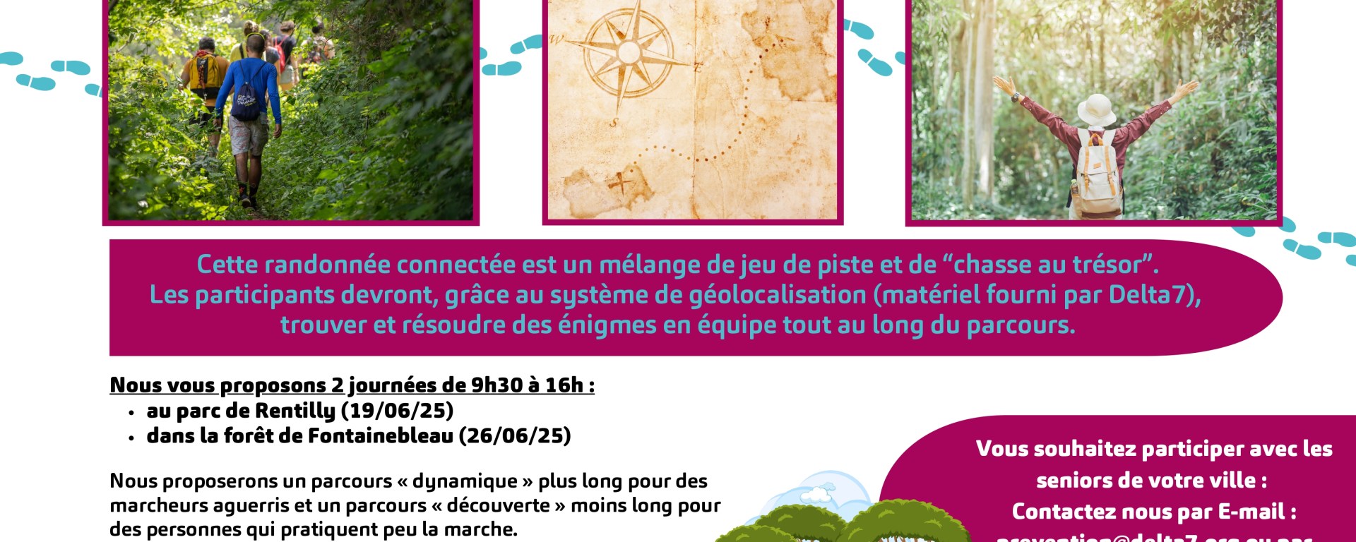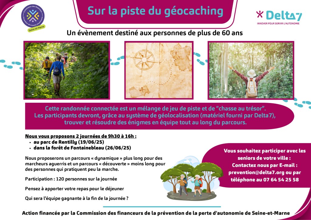 Dans le cadre de ses actions en faveur du bien-être et du lien social des seniors, l‘Association Delta 7 organise une randonnée connectée au Parc de Rentilly (77), le 19 juin 2025 et en Forêt de Fontainebleau le 26 juin 2025. Cet événement innovant allie activité physique, découverte culturelle et initiation au numérique.