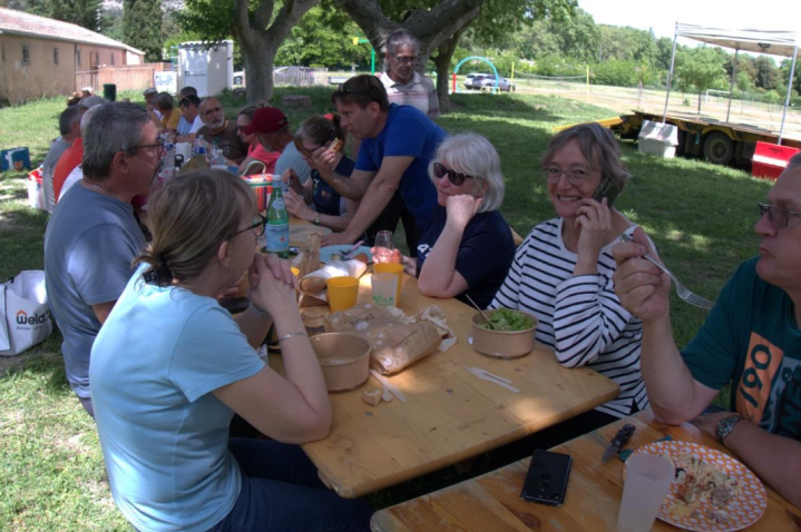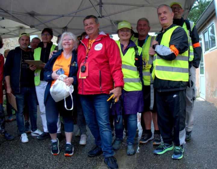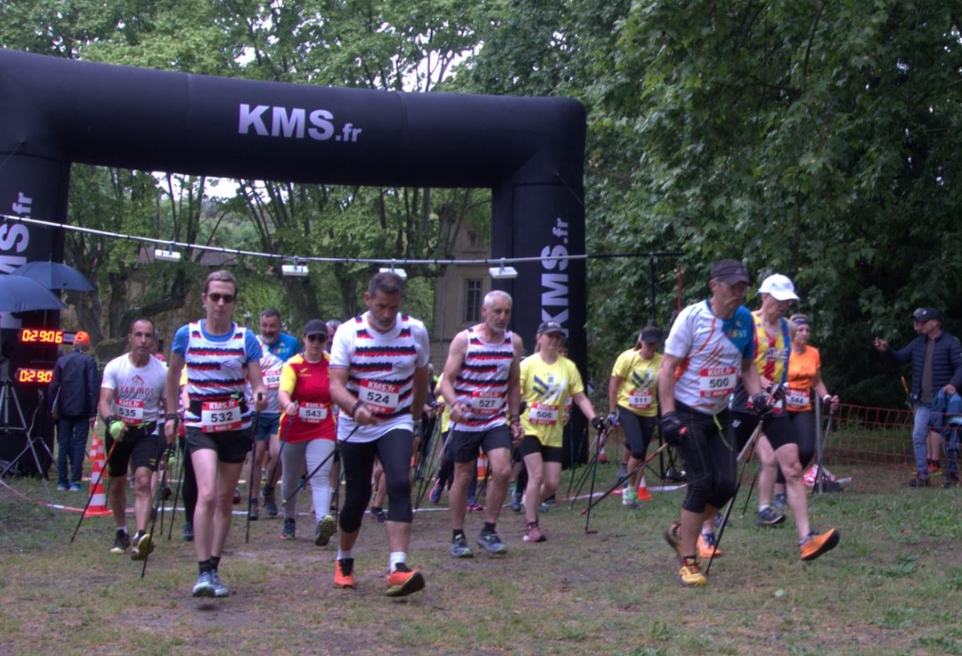 L’épreuve reine étant bien sûr la Nordique Vauclusienne, support des Championnats régionaux et à ce titre obligatoire pour les licenciés de la ligue PCA pour se qualifier aux France 2026, inscrite au Challenge Marche Nordique Tour 2025, une Marche Nordique Compétition Circuit en quatre boucles, 12 300 mètres à ma montre , 290 m de dénivelé positif, une seule côte bien longue qui revient quatre fois, un superbe parcours que l’on connait bien au départ du château de la Croix Chabrière sous ses platanes centenaires, un départ canalisé avec sas horaires, ce qui n’a pas empêché une belle chute et des bousculades, longue ligne droite sablonneuse dans les vignes avant d’attaquer le montée, et c’est la descente délicate avec des pierres qui roulent et des juges vigilants ! Quelques mètres de bitume, à nouveau une boucle dans les vignes et l’on retrouve l’ombre des platanes, sauf que la météo s’est montrée capricieuse, si la pluie de matin avait tassée le terrain, ce fut la douche à mi- parcours pour terminer sous un soleil apprécié !