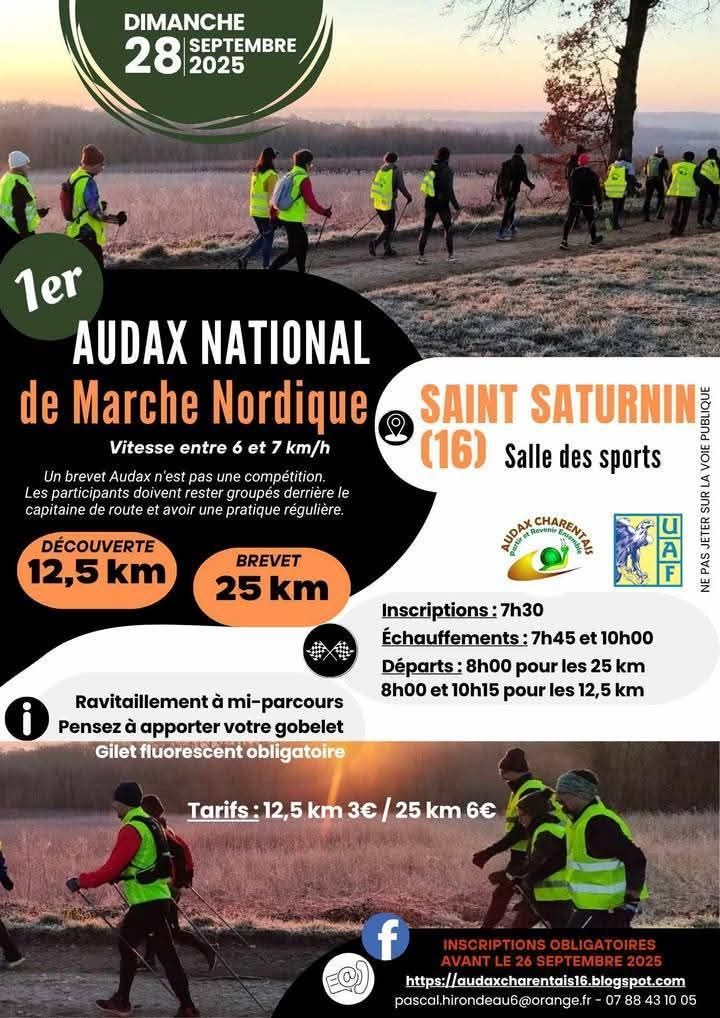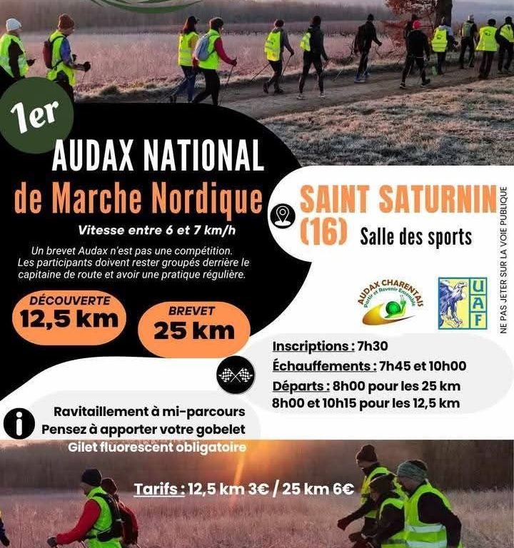 L’Association Les Audax Charentais lancera, à titre expérimental, le premier brevet Audax de marche nordique le dimanche 28 septembre 2025, avec un parcours de 25 km à Saint-Saturnin (16).