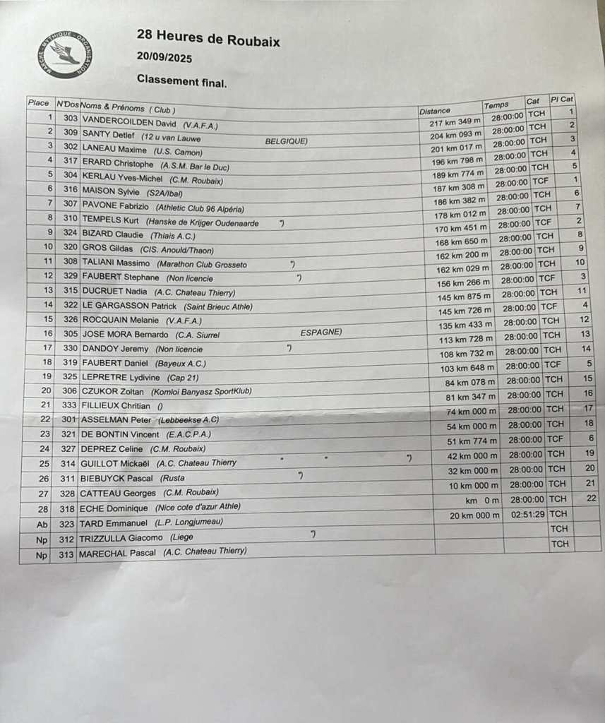 Chez les femmes, la victoire revient à Sylvie Maison, qui a parcouru 186.382 km. Celle qui a remporté à plusieurs reprises la course mythique, Paris Alsace Crédit-Mutuel, qui fêtera en 2026 son centenaire, devance sur le podium féminin, d’autres habituées de la marche de grand fond, Claudie Bizard et Nadia Ducruet.