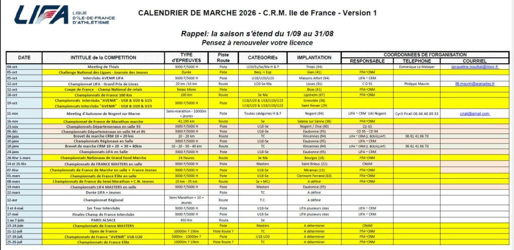 La Ligue d’Ile de France d’Athlétisme a diffusé son calendrier de marche 2026, saison qui s’étend du 1er septembre au 31 août.