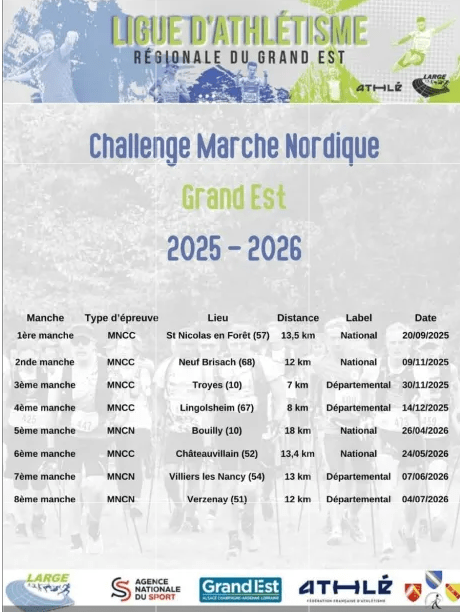 Ci-contre le calendrier du Challenge Marche Nordique Grand-Est pour la saison 2025-2026.