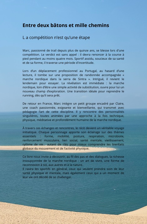 Préfacé par un autre marcheur bien connu, Claude Larmoyer, le livre est une mise en lumière de la marche nordique avec tous les bienfaits qu’elle peut apporter, tant sur le plan physique que sur le plan mental. Chaque page est un pas de plus vers la découverte de la discipline, comme de soi ….