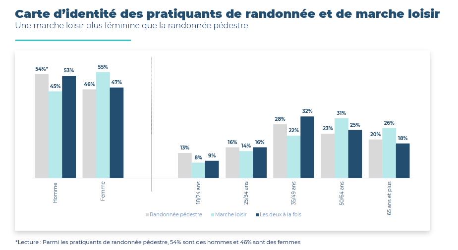 Chez les plus de 50 ans, et particulièrement les femmes (55 %), la pratique de la balade reste majoritaire. Ce double profil (randonneur vs baladeur) confirme la diversité des publics et des usages.