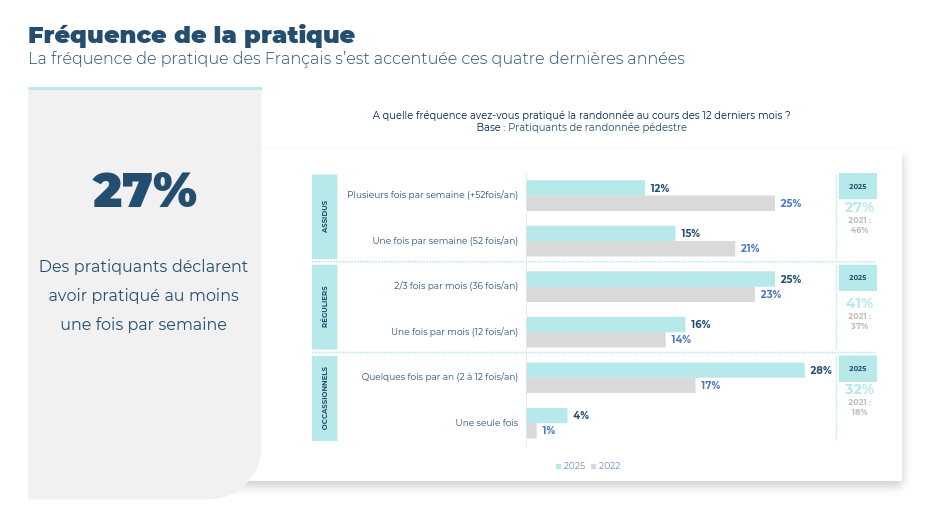 Alors que la pratique assidue fléchit légèrement, la randonnée attire de plus en plus d’occasionnels, notamment des jeunes actifs, curieux mais moins disponibles.
