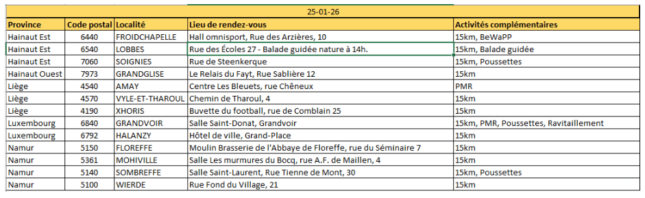 En Belgique, l’ADEPS (Administration de l’Éducation physique, du Sport et de la Vie en Plein Air) organise de nombreuses marches au cours de l’année. Chaque dimanche et jour férié, des promenades balisées sont proposées en une vingtaine de sites disséminés sur tout le territoire de la Wallonie et de Bruxelles. Des parcours de 5, 10, 20 (et parfois 15 km), pour tous les types de randonneurs. Une bonne occasion de marcher pour les belges et les frontaliers.