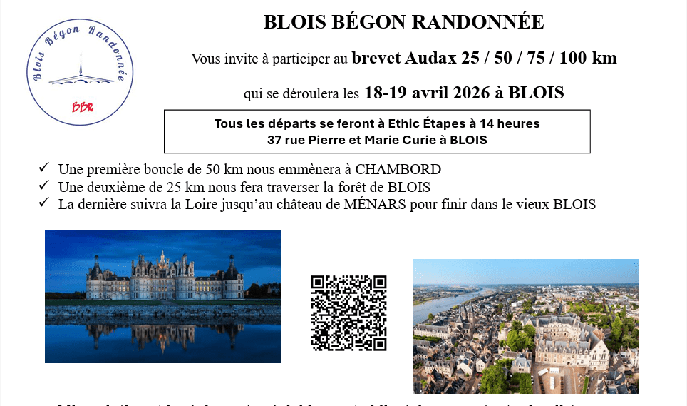 Blois Bégon Randonnée organise un brevet 100 km du 18 au 19 avril 2026. Possibilité de faire 25, 50 ou 75 km.