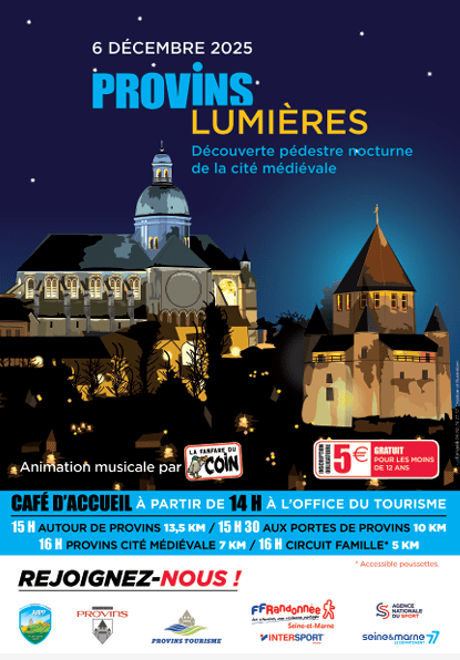 Le Codérando77, l’association locale l’ARPP, la ville de Provins, Provins Tourisme, organisent le samedi 6 décembre 2025, la cinquième édition de « Provins Lumières » afin de découvrir la ville et ses environs à travers 4 randonnées au choix. Point de rendez-vous fixé à 14h00 à l’Office de Tourisme (4, chemin de Villecran 77160 Provins). Il est conseillé de respecter les horaires ci-dessous. L’inscription est … Continuer de lire Provins Lumière : 6 décembre 2025