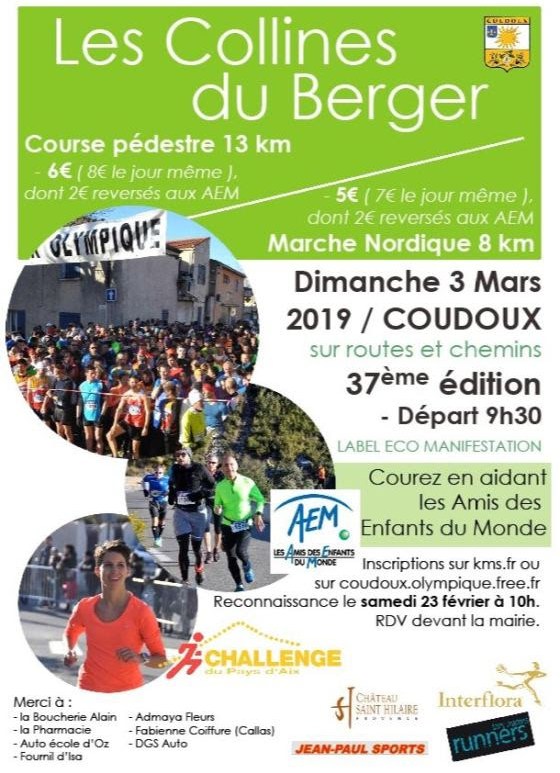 Les Collines du Berger sont un événement incontournable. C’est en effet une 37ème édition qui se prépare pour le dimanche 3 mars 2019 à Coudoux (13). Au programme de cette journée figurent une marche nordique de 8 kilomètres et une randonnée pédestre de 13 kilomètres. Le parcours est programmé sur routes et chemins. Organisation : Coudoux Olympique Organisation : Coudoux Olympique Départ : A 9h30 (Course 13km) et juste … Continuer de lire Les Collines du Berger : Dimanche 3 mars 2019