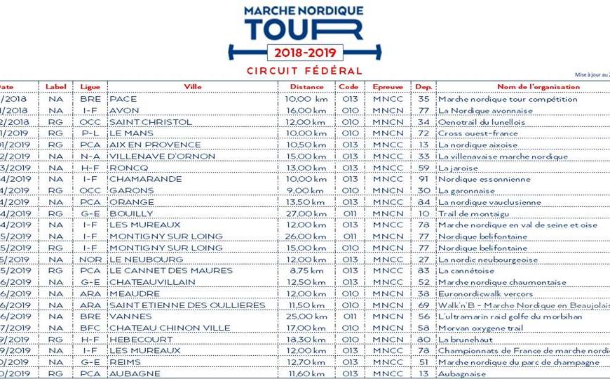 Le Marche Nordique Tour 2018-2019 a été dévoilé par la Fédération Française d’Athlétisme. Le 17 novembre 2018 verra la première épreuve du calendrier avec le Cross National de Pacé. La Nordique Avonnaise et l’Oenotrail du lunellois suivront avant une année 2019, qui s’annoncent riche en épreuves. A noter qu’à l’issue de Nordique Avonnaise, le 25 novembre prochain, seront remis les Trophées du Challenge MNT 2018 : Classement Féminin … Continuer de lire Calendrier Marche Nordique Tour 2018-2019