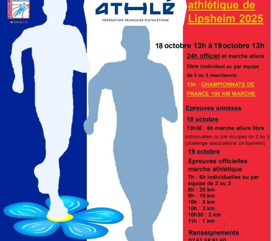 La 3ème édition des 24 Heures de Lipsheim, oganisée par Sylvie Maison, s’est déroulée du samedi 18 au dimanche 19 octobre 2025. L’occasion de retrouver les spécialistes de la marche de grand fond qui se sont disputés dans un premier temps pour le titre de Champion de Fance du 100 km. Le titre de Champion de France du 100 km a été remporté par Vincent … Continuer de lire Retour sur les 24 Heures de Lipsheim 2025